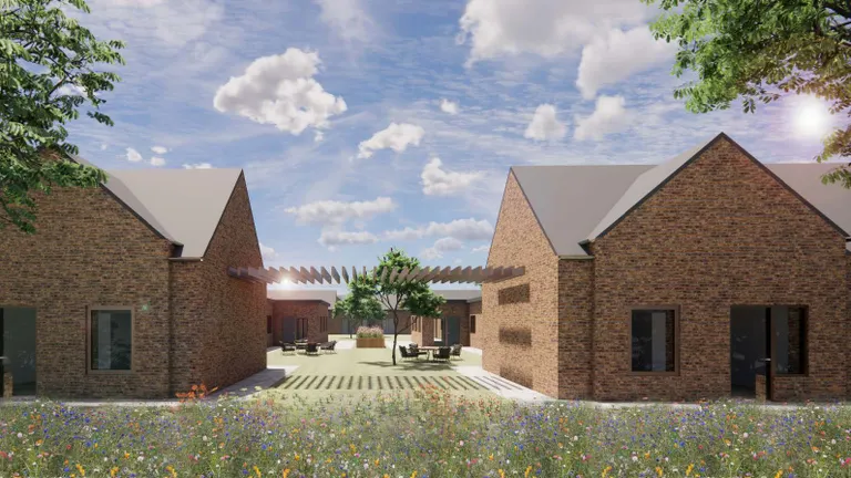 Hovedindgangen til plejecentret markeres af en smuk pergola, der naturligt fører besøgende til plejecentrets ankomstområde.
