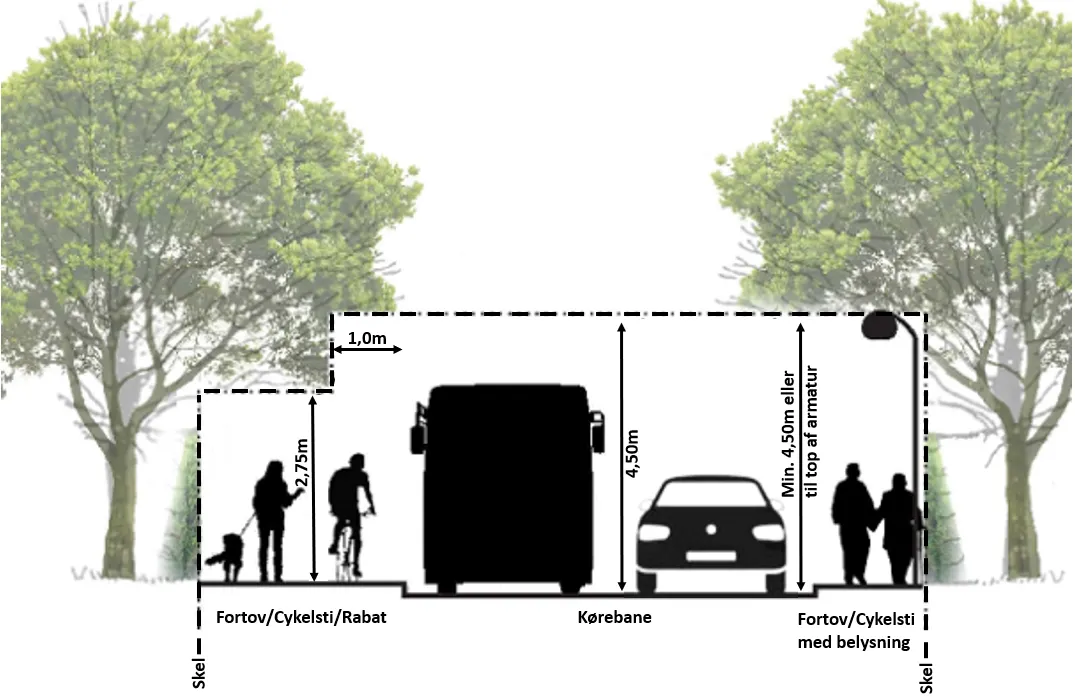 Træer og buske skal over kørebanen, samt 1 meter på hver side, være beskåret med en fri højde på 4,5 meter.