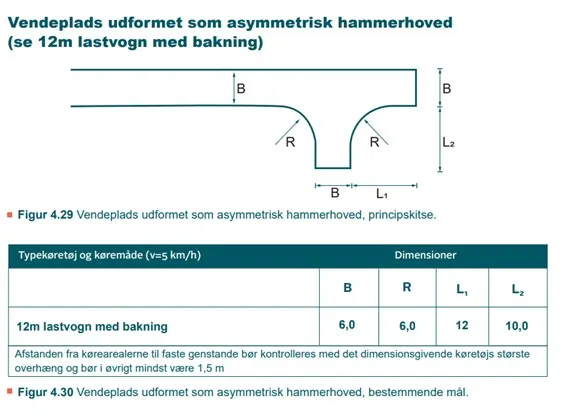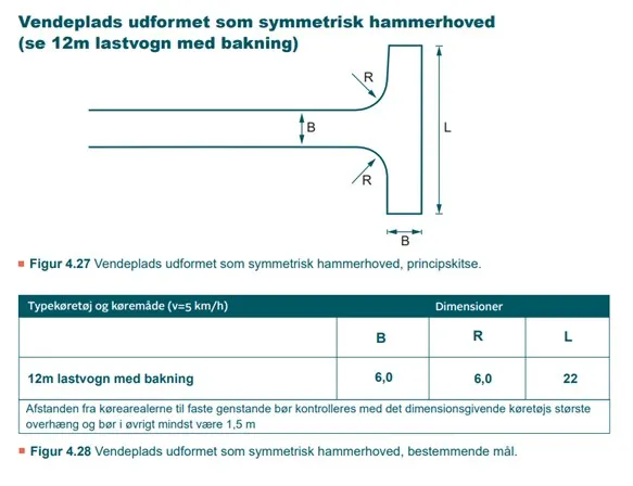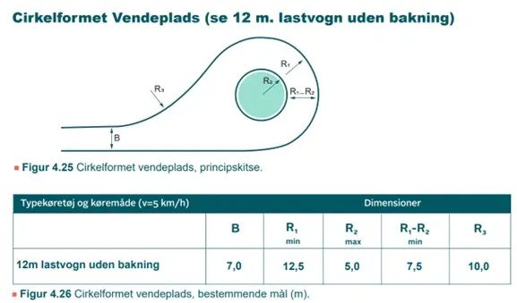 - Skal lastbilen vende på en vendeplads, skal denne udføres efter en 12 m Se nedenstående illustrationer af vendepladser iflg. Vejdirektoratets vejregler. Lastbilen må ikke bakke over længere strækninger, bakkelængden defineres af Vej og Trafik, Herning Kommune.