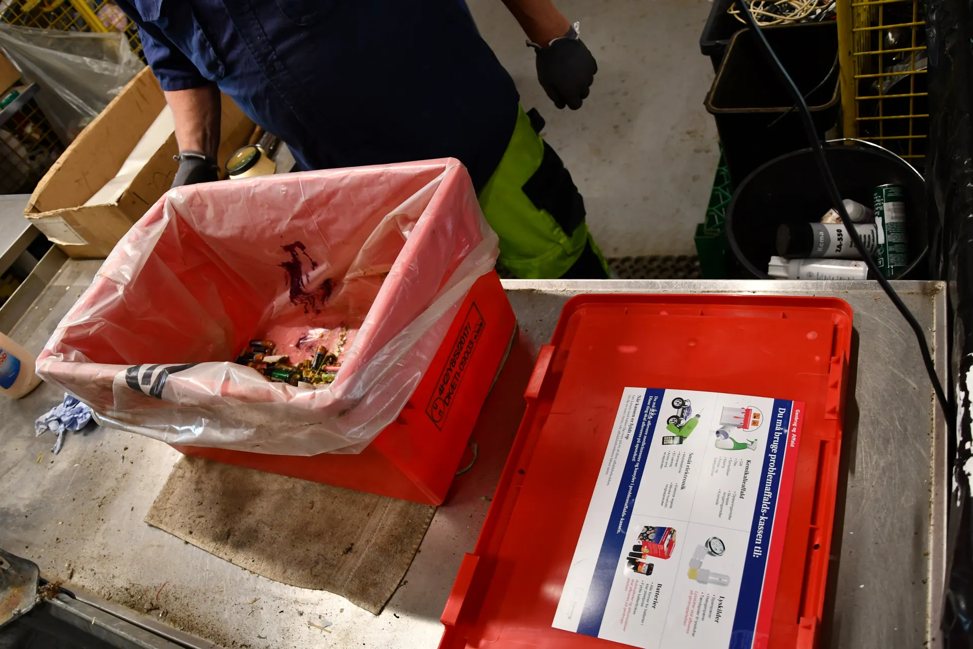 Alle kasser med farligt affald køres til Herning Genbrugsplads, hvor de håndsorteres.