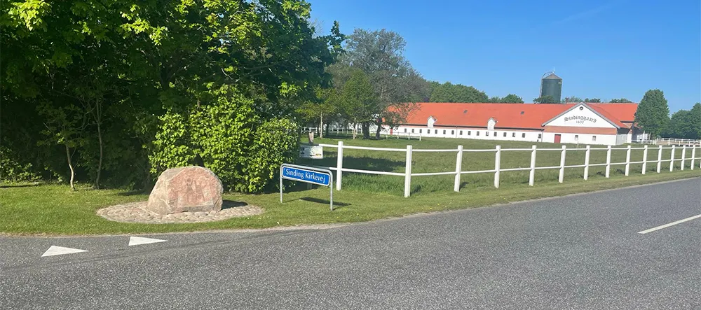 Du følger Sinding Hovedgade, som går over i Sindinggårdvej, og den følger du til du når Sinding Kirkevej på højre hånd. Her er der en stor sten samt en QR Reader, som fortæller om Sindinggård.