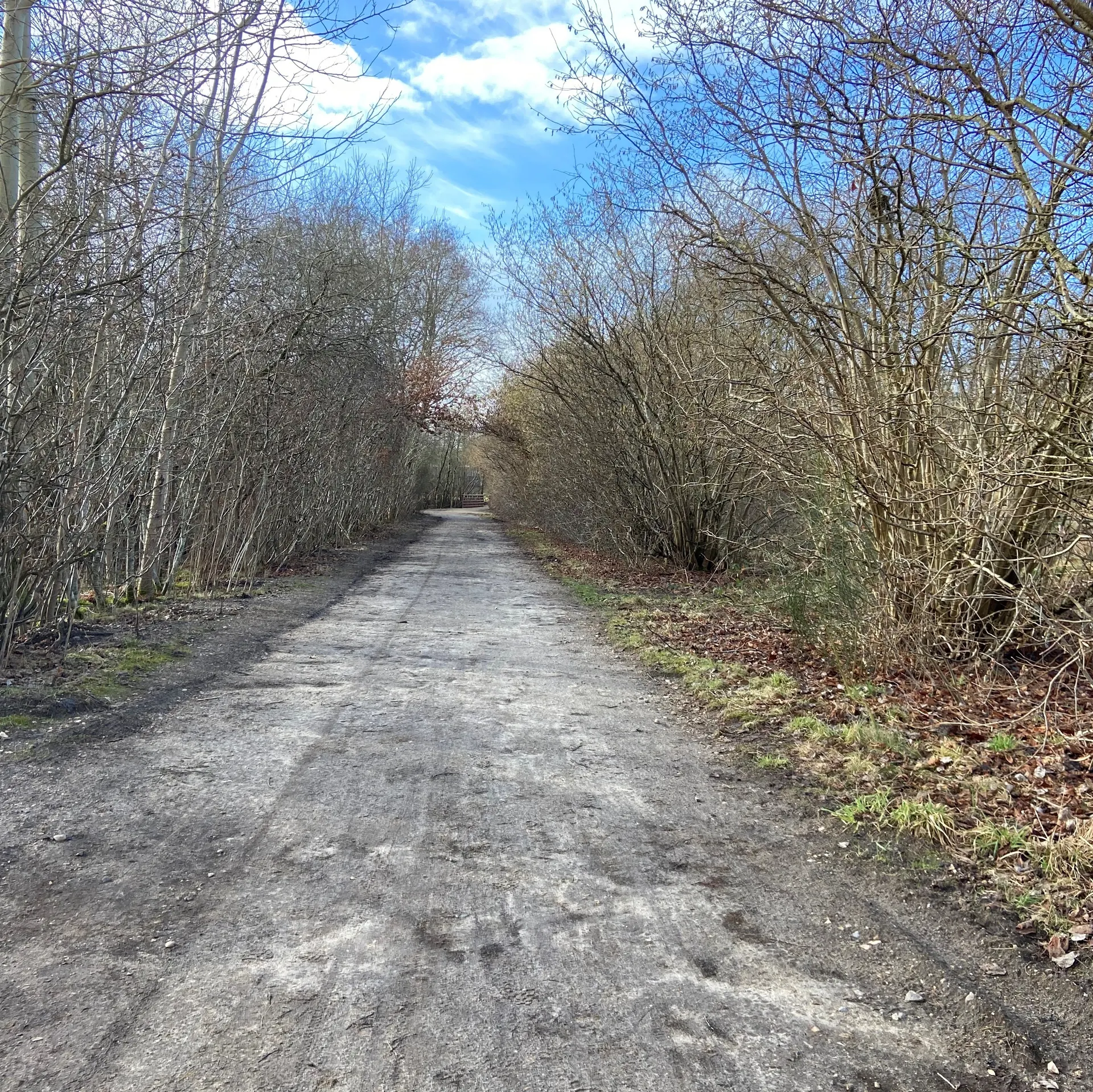 Gå videre ad sti gennem skov til I når til grusvej.