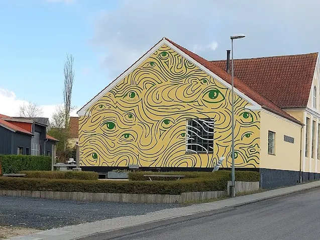 Gå ad Møltrupvej op igennem byen – bemærk bl.a. Gavlmaleriet (= Verdensmålsgavl nr. 13 – ”Klimaindsats”) på det Gamle Mejeri (Thors Design).
