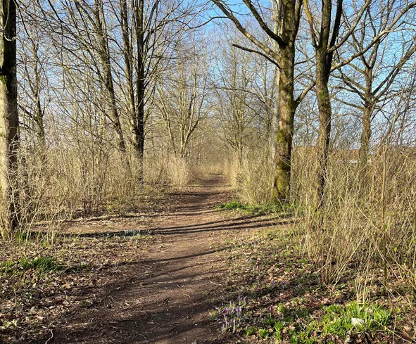 Sundsvej/Ilskovvej krydser du via fodgængerovergangen til Kjærgårdsvej forbi FDF`s kredshus videre til Hollingholtvej, hvor vi går til højre ind på en trampesti langs byens udkant.