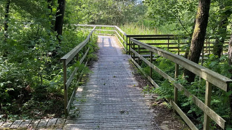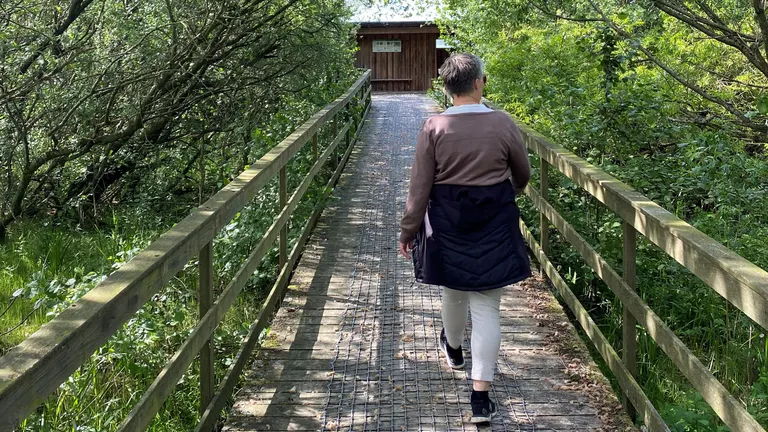 Turen til skjulet går gennem træer og videre ud på en board-walk i træ, der fører helt hen til fugleskjulet.