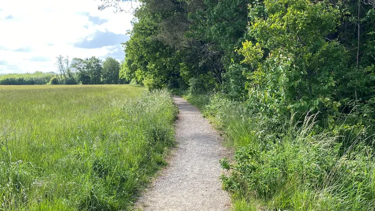 Sti fra parkeringspladsen mod søen.