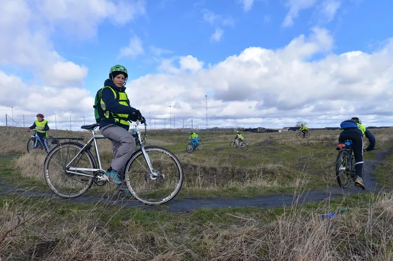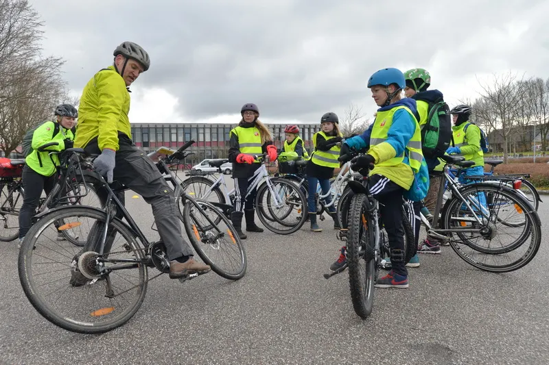Alle har valgt en cykel og fået samling på cykelhjelm, refleksvest og drikkedunk, og så er der afgang mod Herningsholm Erhvervsskole.