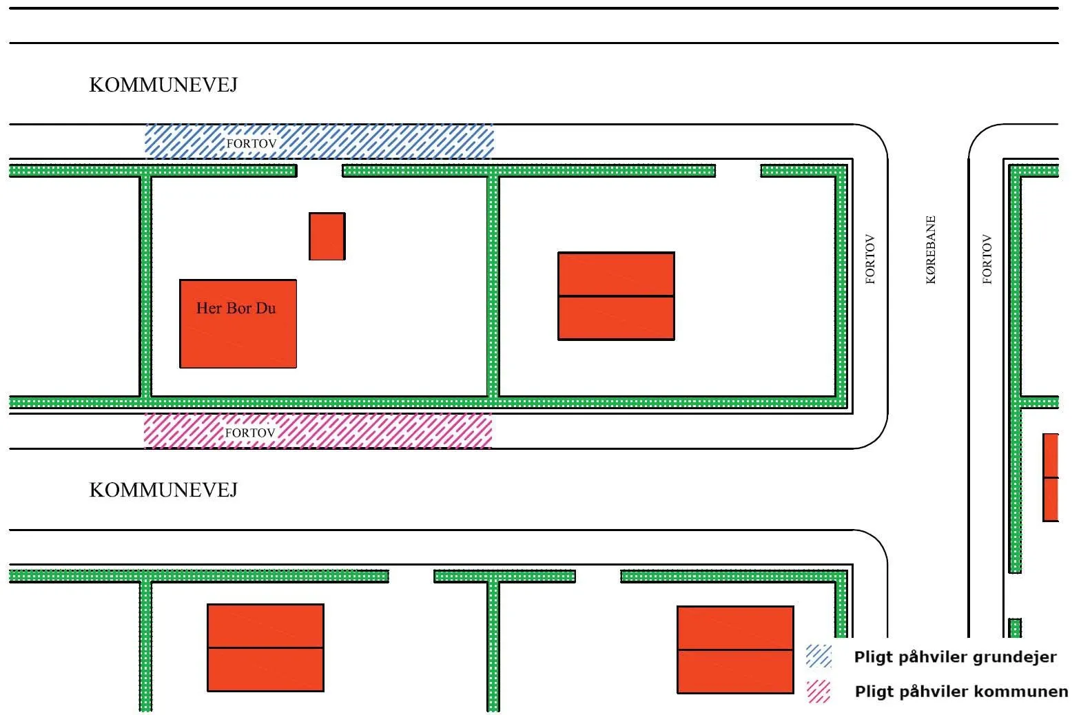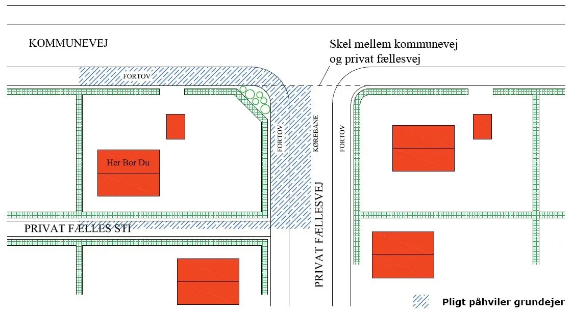 Pligten kan i dette tilfælde pålægges grundejeren for det kommunale fortov. Tilsvarende kan pligten pålægges for den private fællesvej og den private fællessti for den del af vejen og stien, der ligger nærmest ejendommen.