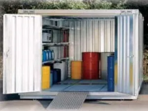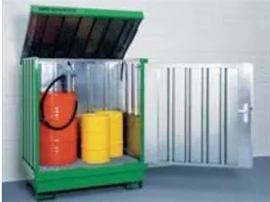 Mindre oplag i tromler og dunke kan opbevares i specielle containere med spildbakke. Oplaget bør kunne aflåses, således at uvedkommende ikke kan forårsage forurening (se nedenstående eksempel):