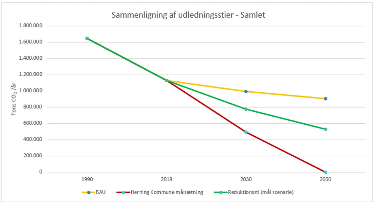 Herning Kommunes mål for reduktion af CO2 skal ses ud fra en baseline, som er den estimerede CO2-udledning i Herning Kommune i 1990.